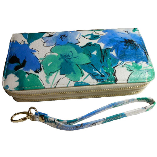Cartera con estampado gráfico de flores, bolsillos dobles con cremallera, azul y verde, para billetes y monedas, de diseñador, azul y verde