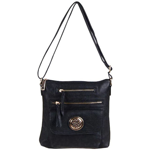Bolso tipo cartera con medallón y diseño floral dorado, color negro y bolsillos con solapa