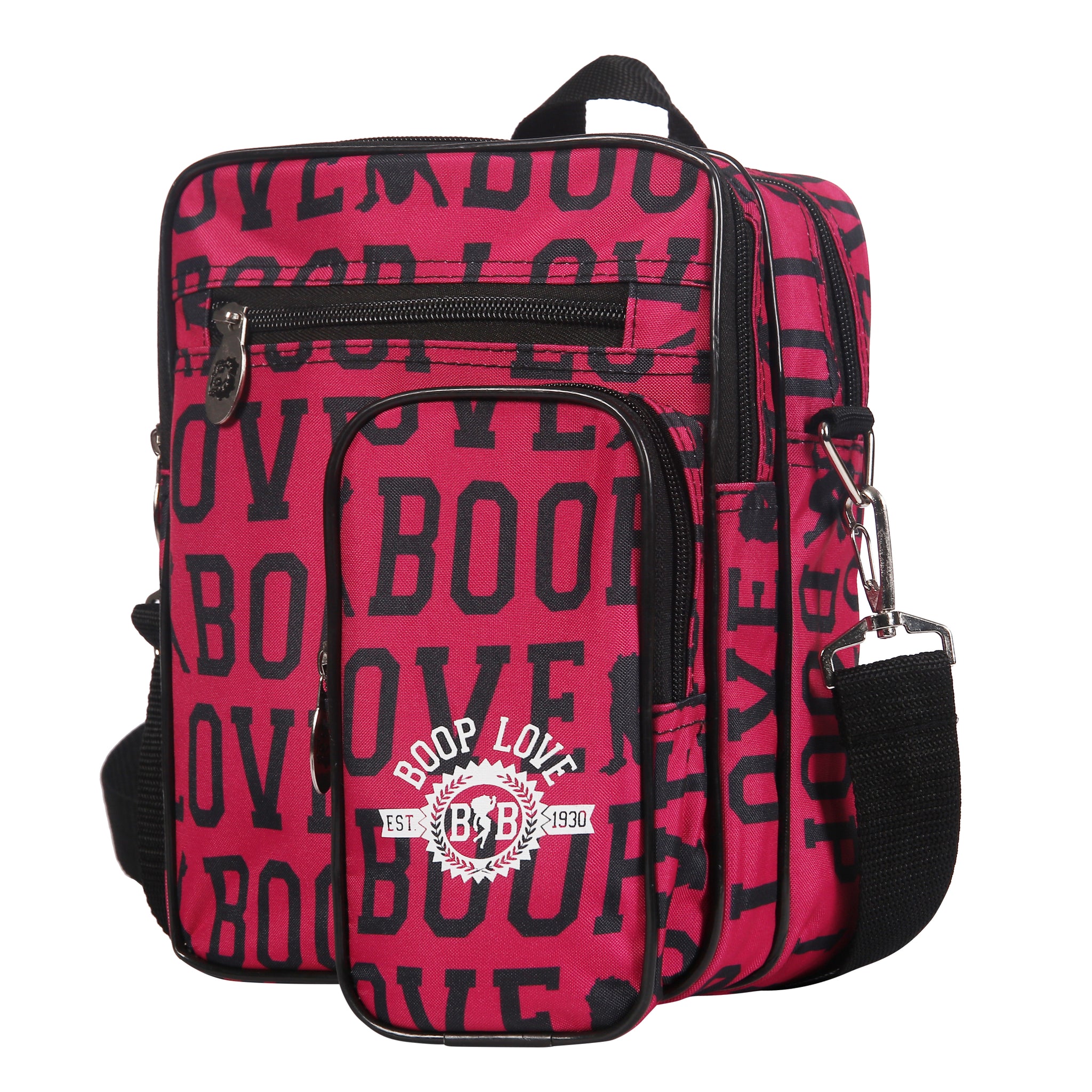 organize small accessories for day to day travel inside this casual little Betty Boop utility  cellphone  pockets messenger sling bag. made of fabric and features a small shape and a classic Betty Boop design with zipper holders in the front and an detachable adjustable strap that can be carried on the shoulder or slung across the body for hands free travel. This utility bag has a zip around closure on the main compartment, a zip around front organizer pocket with a cell phone slip pocket and pen sleeves, and a rear zipper pocket that offers added storage for valuables that you want to keep within easy reach.
